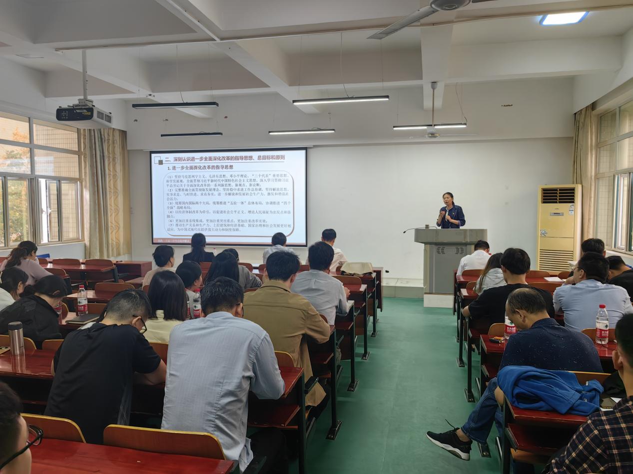 潘晔教授以“紧扣中国式现代化主题,进一步全面深化改革”为主题进行宣讲。她指出,党的二十届三中全会是在以中国式现代化全面推进强国建设、民族复兴伟业的关键时期召开的一次十分重要的会议,彰显了以习近平同志为核心的党中央将改革进行到底的坚强决心和强烈使命担当,是对新时代新征程举什么旗、走什么路的再宣示,对以中国式现代化全面推进强国建设、民族复兴伟业具有重大而深远的意义。潘教授详细讲解了进一步全面深化改革、推进中国式现代化的重大意义和总体要求、贯彻好的六条原则,尤其做好“五个方面”的重点工作。最后,潘晔教授希望全体师生党员要认真学习党的二十届三中全会精神,坚决把思想和行动统一到党中央决策部署上来,切实以进一步全面深化改革推进中国式现代化理工实践中。