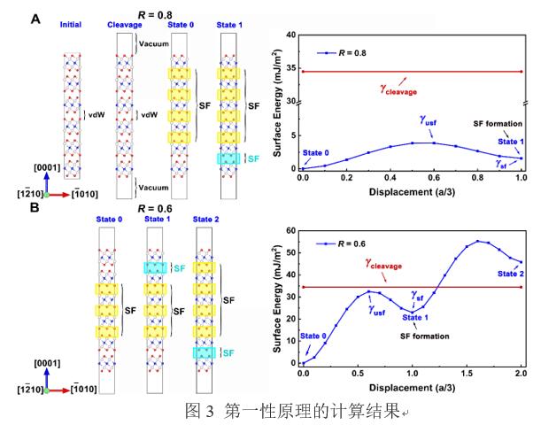 通过第一性原理研究发现,这种不同的结构演化取决于堆垛层错能与解理能之间的竞争关系,高相对密度的堆垛层错模型中,滑移诱导堆垛层错形成比解理更容易,导致结构重组形成具有更小层间距的全堆垛层错结构。