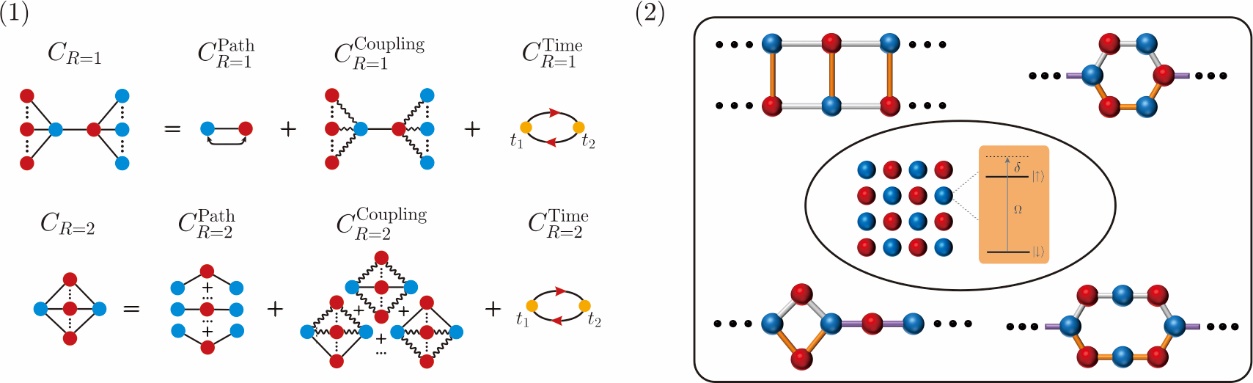 为此,研究团队基于可编程的里德堡原子量子模拟器,利用Magnus展开方法系统研究了非平衡动力学中关联的建立机制。通过严格的解析推导与精确的数值模拟,团队发现关联的建立遵循一个普适的叠加定律:在固定的曼哈顿距离下,两点间的反铁磁关联强度等于所有连接它们的最短路径所贡献的关联的代数和。该定律不受路径等价性、晶格几何构型以及系统驱动方式的影响,展现了很强的鲁棒性。这意味着,即使是大规模复杂量子系统,其关联行为也可通过基本路径贡献的叠加来理解。